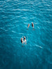 Two bottlenose dolphins breach the surface of the clear waters in Baja California Sur, Mexico.