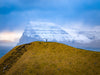 A lone figure stands on a warm-toned hill in the Faroe Islands, framed by a towering snowy mountain behind. The contrast of colors and isolation creates a striking aerial composition.