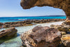 A rugged coastal window where ancient rock arches frame crystal-clear shallows and a horizon of deep blue, capturing the quiet dialogue between stone and sea.