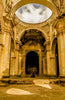 The remnants of a once-majestic church or cathedral rise into the open sky. Arched columns and intricate stonework stand defiantly, sheltering only shadows and the occasional curious traveler beneath their ruined dome.