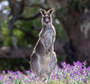 On the Northern outskirts of Melbourne, Australia, the warm sun shines down on a kangaroo in a field of purple flowers - producing a warm glow around this iconic Australian creature as it stares directly into the camera.