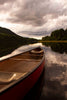 This peaceful landscape print captures a red canoe floating on a perfectly still river beneath dramatic dusk clouds.