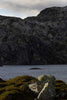 This moody landscape print captures a rugged Norwegian lake surrounded by towering granite cliffs under a dramatic sky. Soft, low light highlights the textured boulders and patches of moss in the foreground, adding depth and atmosphere.