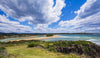 A tranquil inlet glows under a bright sky, framed by gentle greens and the calm rise of distant hills.
