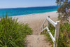 A quiet coastal path descends through soft dune grass to a sunlit shoreline, where white sand meets layered shades of turquoise and deep ocean blue.